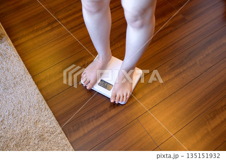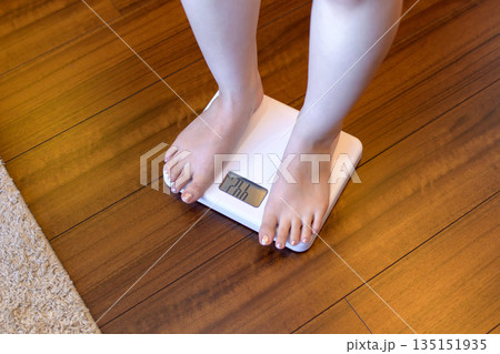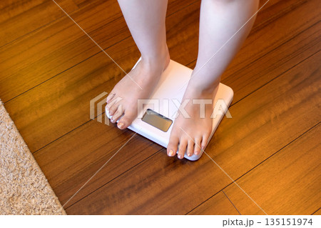 一位身穿瑜珈服的日本女性站在體重計上,露出她的雙腳。她穿著減肥緊身褲,膚色也淡化。