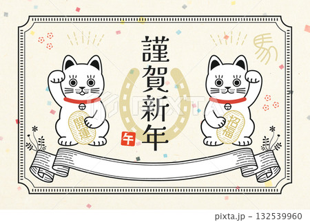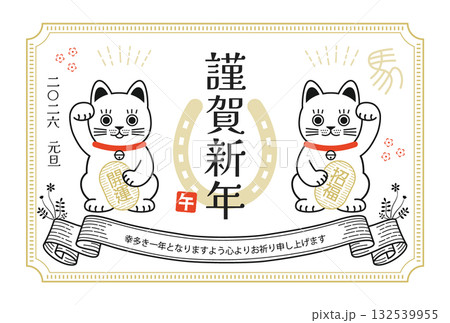 復古簡約的2026新年賀卡設計:招財貓(橫版),無註釋