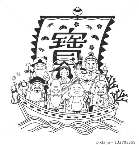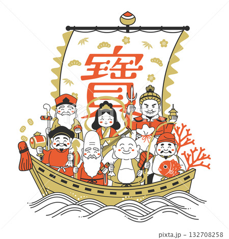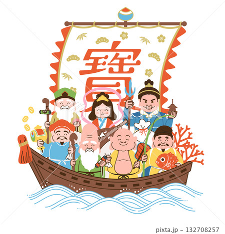 一幅色彩繽紛的寶船插圖,船上載著七福神。