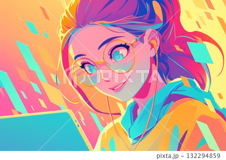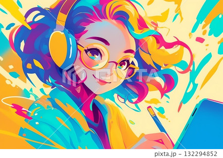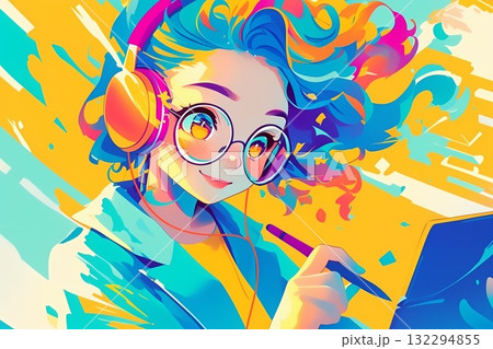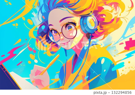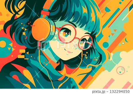 戴著耳機聽音樂的女人(插圖,普普藝術,色彩鮮豔)