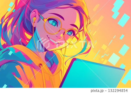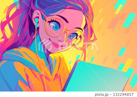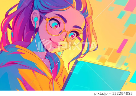 戴眼鏡和耳機的女孩(聽音樂、學習、電子學習)