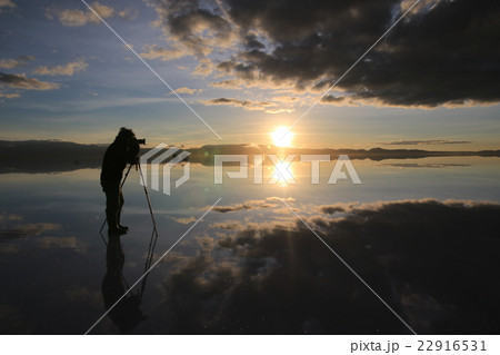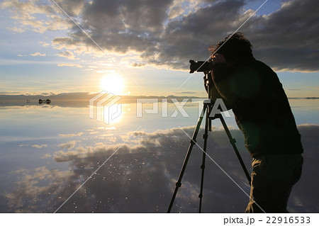 拍攝Uyuni鹽湖早晨太陽的人們