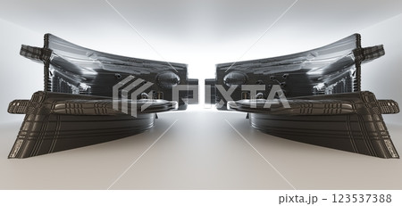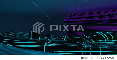Abstract architectural minimalistic background. Laser show in the ultraviolet spectrum. Modern impulse tunnel. Futuristic space sci-fi frame neon backlight. 3D illustration and rendering.