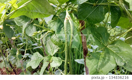 Fresh Organic Long Beans in Garden with Green Paddy Field Backdrop