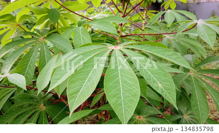 Fresh Green Cassava Leaves with Red Stems on Manihot Esculenta Plant