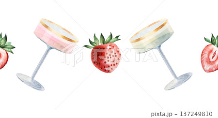 Seamless watercolor border with birthday elements: wine, champagne glasses and strawberries. Elegant summer design for packaging, textiles, stationery and festive branding