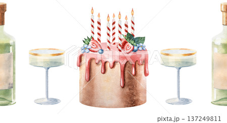 Seamless watercolor border with birthday elements: wine, champagne glasses and cake with candles and berries. Elegant summer design for packaging, textiles, stationery and festive branding
