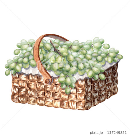 Watercolor wicker basket full of green grapes. Fresh fruit picnic composition for food packaging, farmers market design, organic branding, summer illustrations and healthy lifestyle projects