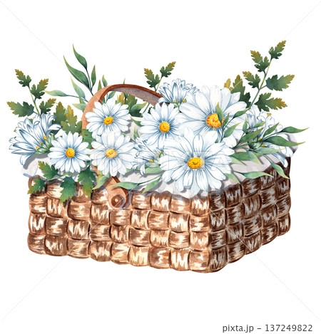 Watercolor wicker basket filled with white daisies and greenery. Romantic floral composition for spring greeting cards, wedding invitations, rustic decor, botanical prints, seasonal design projects