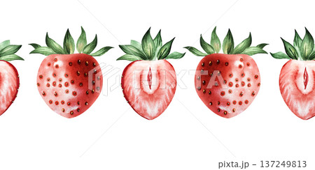 Seamless watercolor border with strawberries. Cute summer festive design for birthday, wrapping paper, textile, cards and invitations. Hand drawn illustration with sweet summer mood