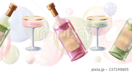 Seamless watercolor border with birthday elements: wine, champagne glasses and bubbles. Elegant summer design for packaging, textiles, stationery and festive branding