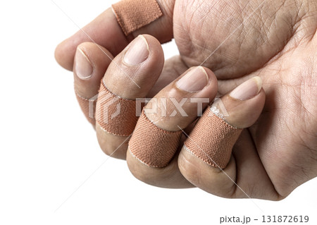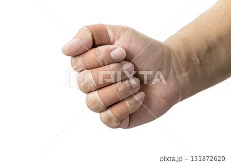 Hand with bandaged fingers is clenched into fist, showing protective covering on each finger. bandages are beige and background is plain white