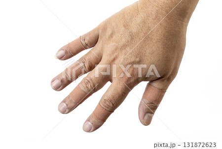 Hand with finger splints and bandages is shown against white background, indicating injury or support. skin tone is light brown, and bandages are beige, providing neutral contrast