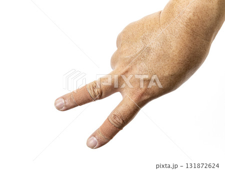 Hand with two fingers extended, each wrapped in bandages, is shown against white background. gesture resembles peace sign or number two. skin tone is light brown