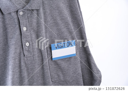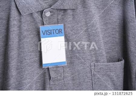 Visitor badge is attached to gray shirt, featuring collar and pocket. badge is prominently displayed, indicating temporary guest status