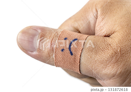 Thumb wrapped in bandage with sad face drawn on it, conveying sense of injury or discomfort. close up image highlights texture of skin and bandage