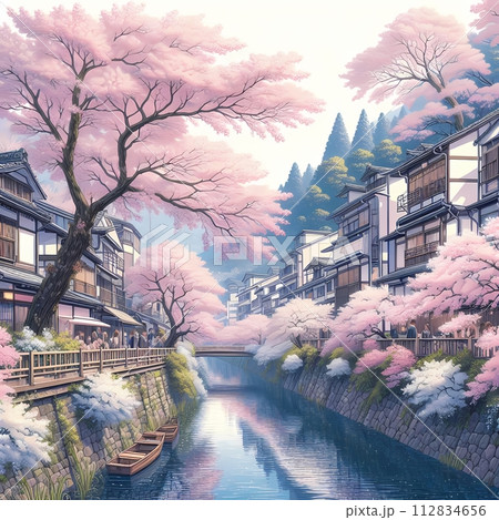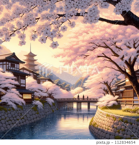 復古街景中,河邊櫻花盛開