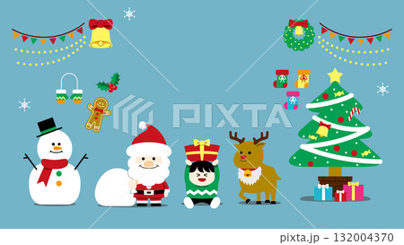 可愛的聖誕插圖集(聖誕老人、馴鹿、禮物、樹、雪人),帶有文字和背景