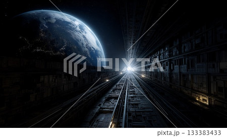 穿越機械城市的太空隧道和地球夜景