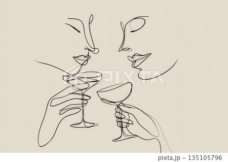 極簡線畫,描繪了兩個人舉杯祝酒和他們的酒杯。
