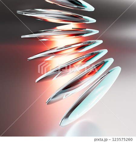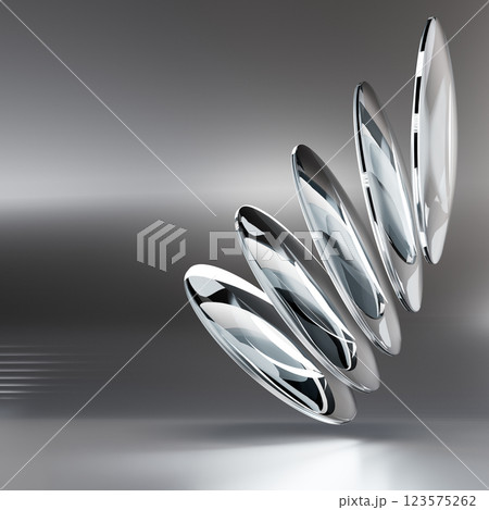 Colorful futuristic 3D illustration with mirrored glass or metal ellipses floating in a semicircle arc along a line on a gradient background. Unusual conceptual object for background