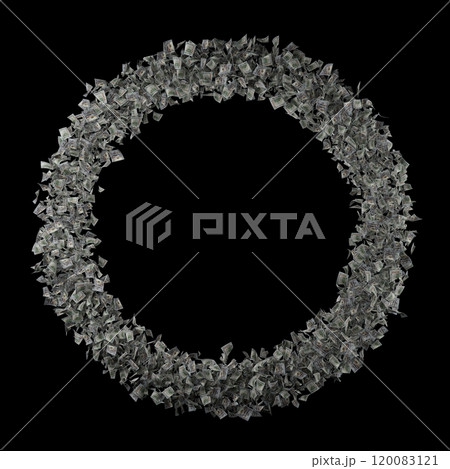 A voluminous circle, ring, consisting of hundreds of maximally realistic dollar bills floating on a black background. Frame for a picture, banner or any other use. 3d render