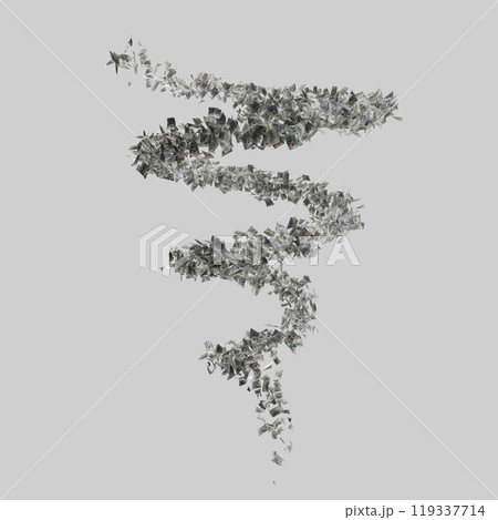 The image shows a 3D vortex resembling a tornado made of numerous realistic banknotes. The bills spiral, creating the effect of a dynamic cash flow on a white background, gradually disappearing.