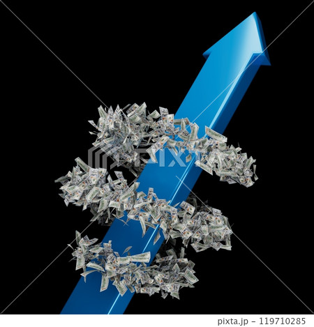 Upward blue arrow with dollar bills, symbolizing financial growth, profit increase, business success, or economic progress. Isolated on a black background. Perfect for finance and investment themes.