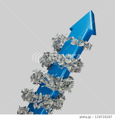 Upward blue arrow with dollar bills, symbolizing financial growth, profit increase, business success, or economic progress. Isolated on a light gray background. Perfect for finance and investment
