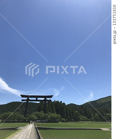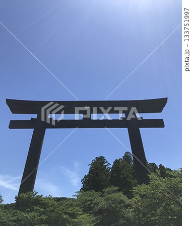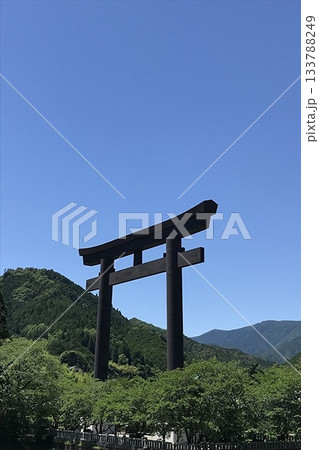和歌山縣一座巨大的鳥居在藍天的襯托下熠熠生輝